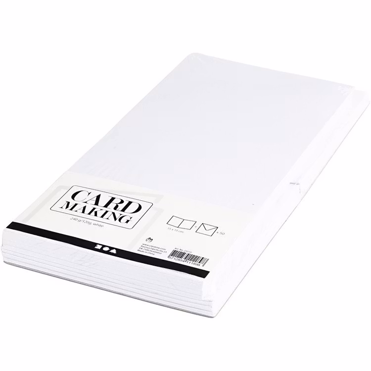 Kort och kuvert vita 15x15 Produkten är tyvärr slut i lager. :( Kvadratiska, dubbla brevkort av genomfärgad kartong (240 g) med matchande fukthäftande kuvert (120 g).Set med 50 kort och kuvert kortstl. 15x15 cm, kuvertstl. 16x16 cm
